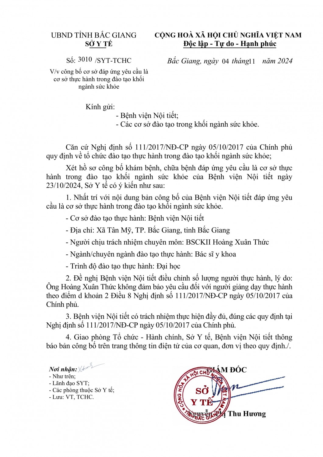Xét hồ sơ công bố khám bệnh, chữa bệnh đáp ứng yêu cầu là cơ sở thực hành trong đào tạo khối ngành sức khỏe của Bệnh viện Nội tiết ngày