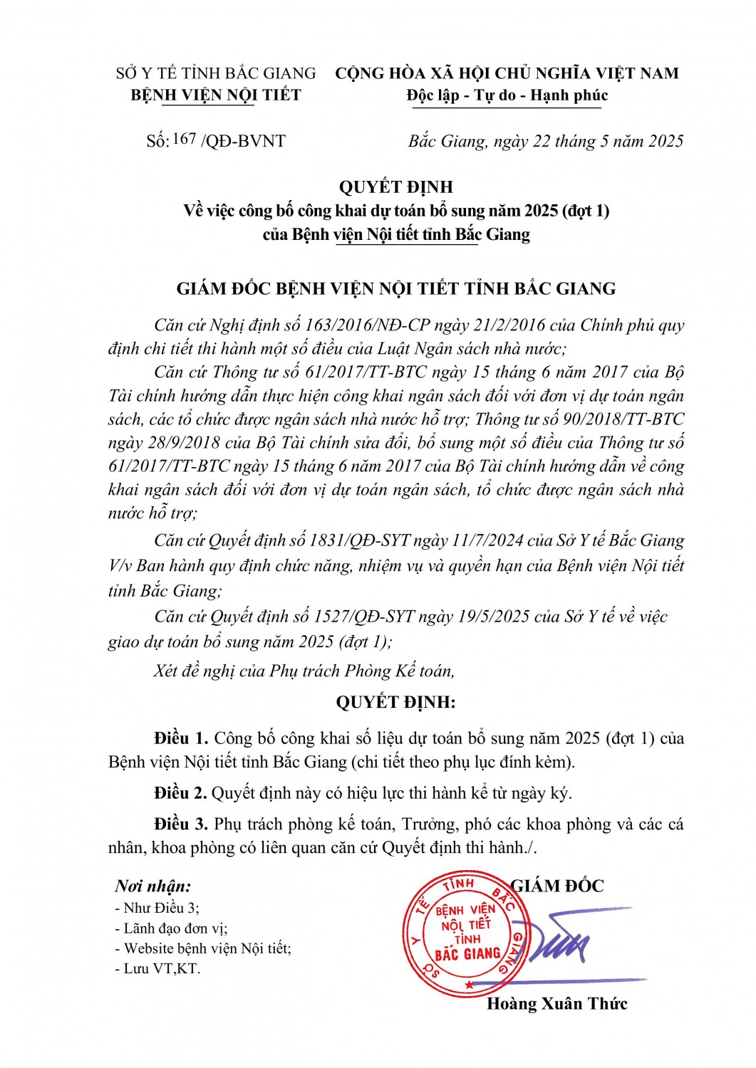 Công bố công khai số liệu dự toán bổ sung năm 2025 (đợt 1) của Bệnh viện Nội tiết tỉnh Bắc Giang (chi tiết theo phụ lục đính kèm).