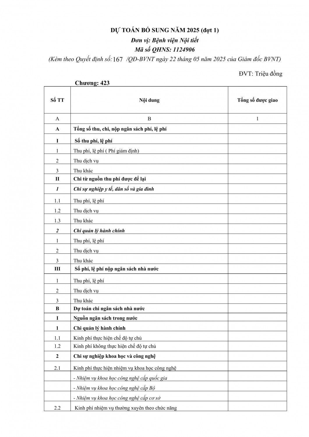 Công bố công khai dự toán bổ sung năm 2025 (đợt 1) của Bệnh viện Nội tiết tỉnh Bắc Giang