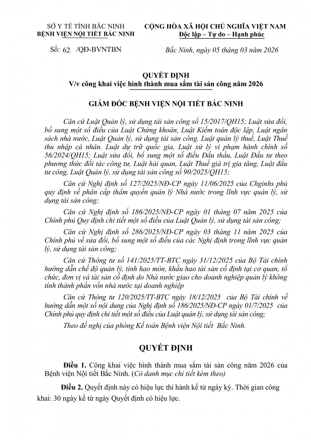 Về việc công bố công khai dự toán thu, chi ngân sách nhà nước năm 2026 (lần 1) của Bệnh viện Nội tiết Bắc Ninh