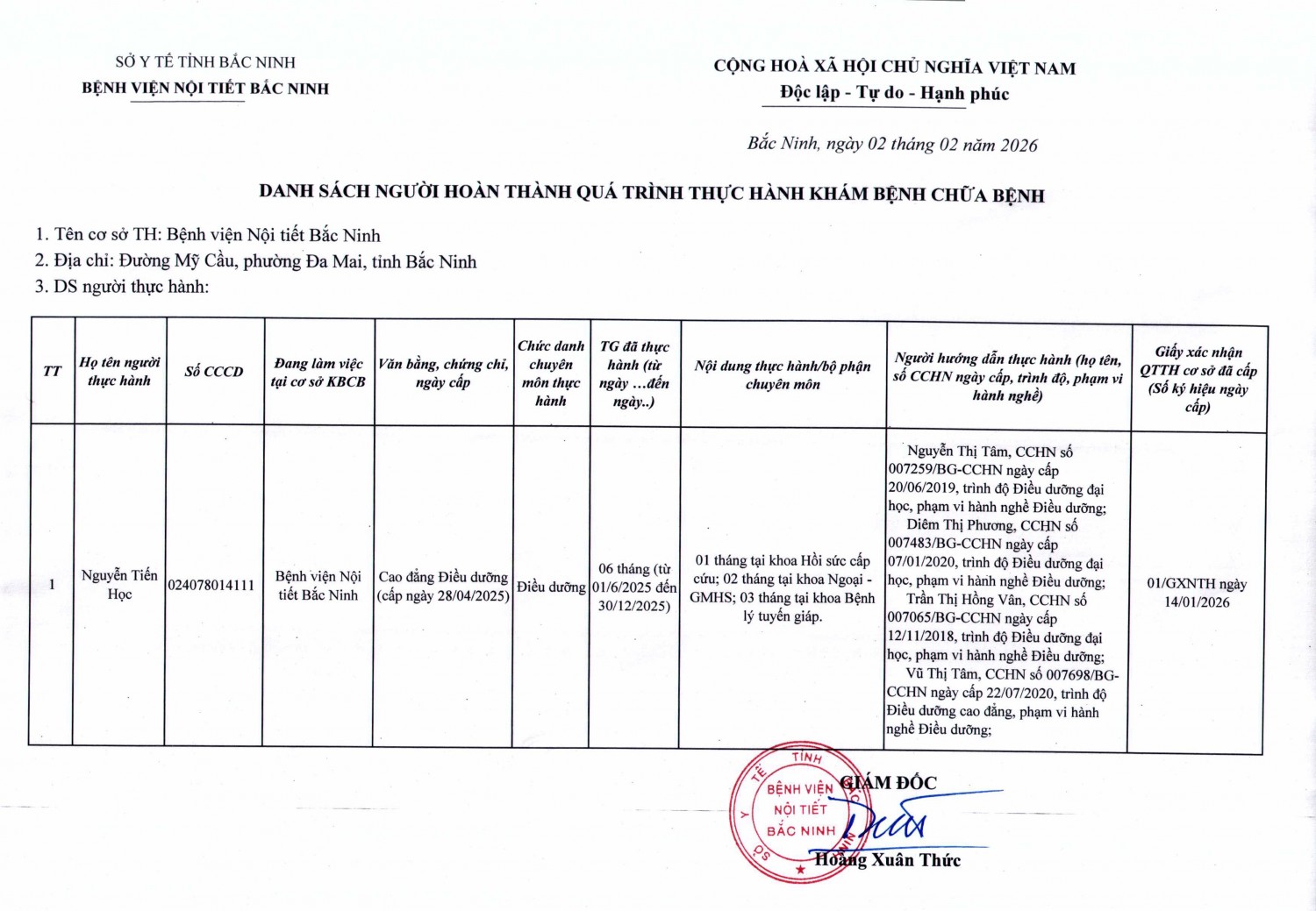 Danh sách người thực hành, hoàn thành quá trình thực hành Khám chữa bệnh tại Bệnh viện Nội tiết Bắc Ninh
