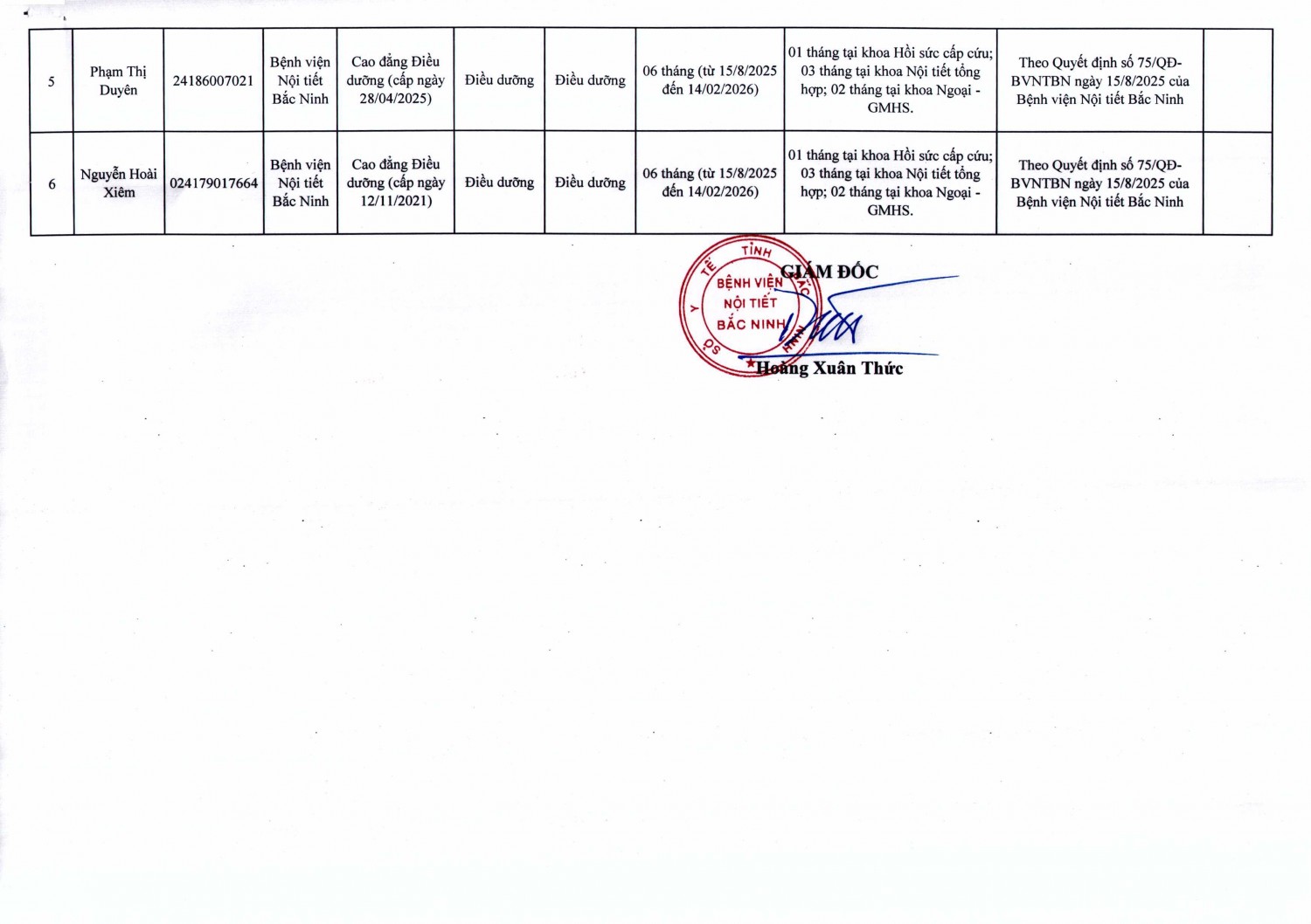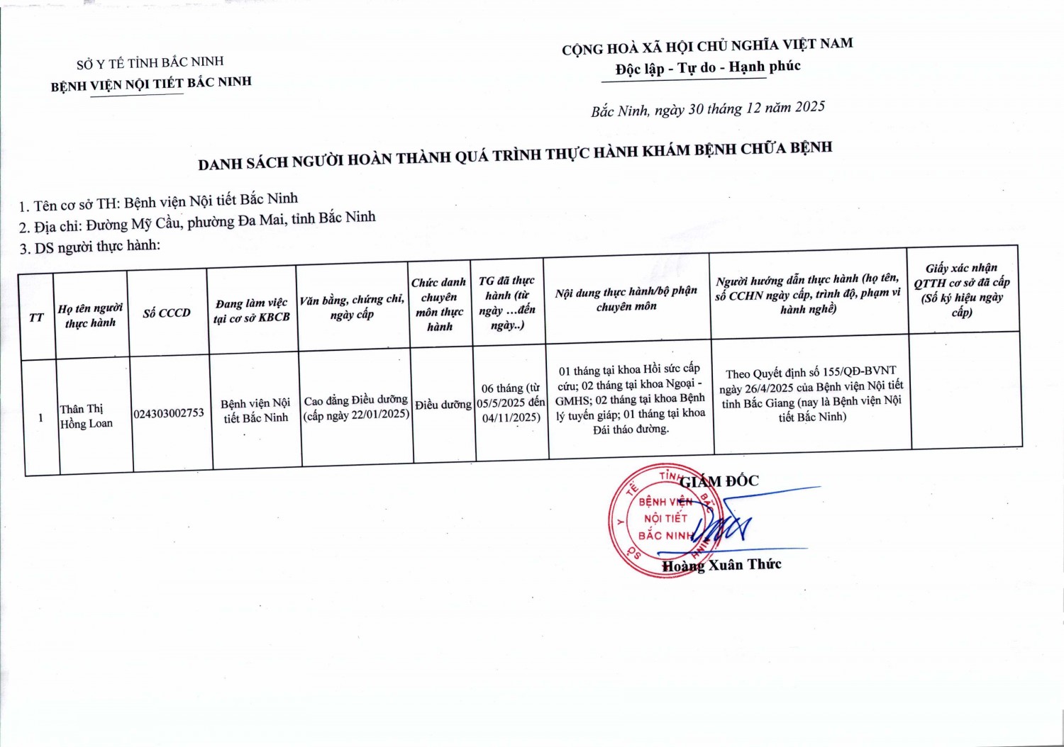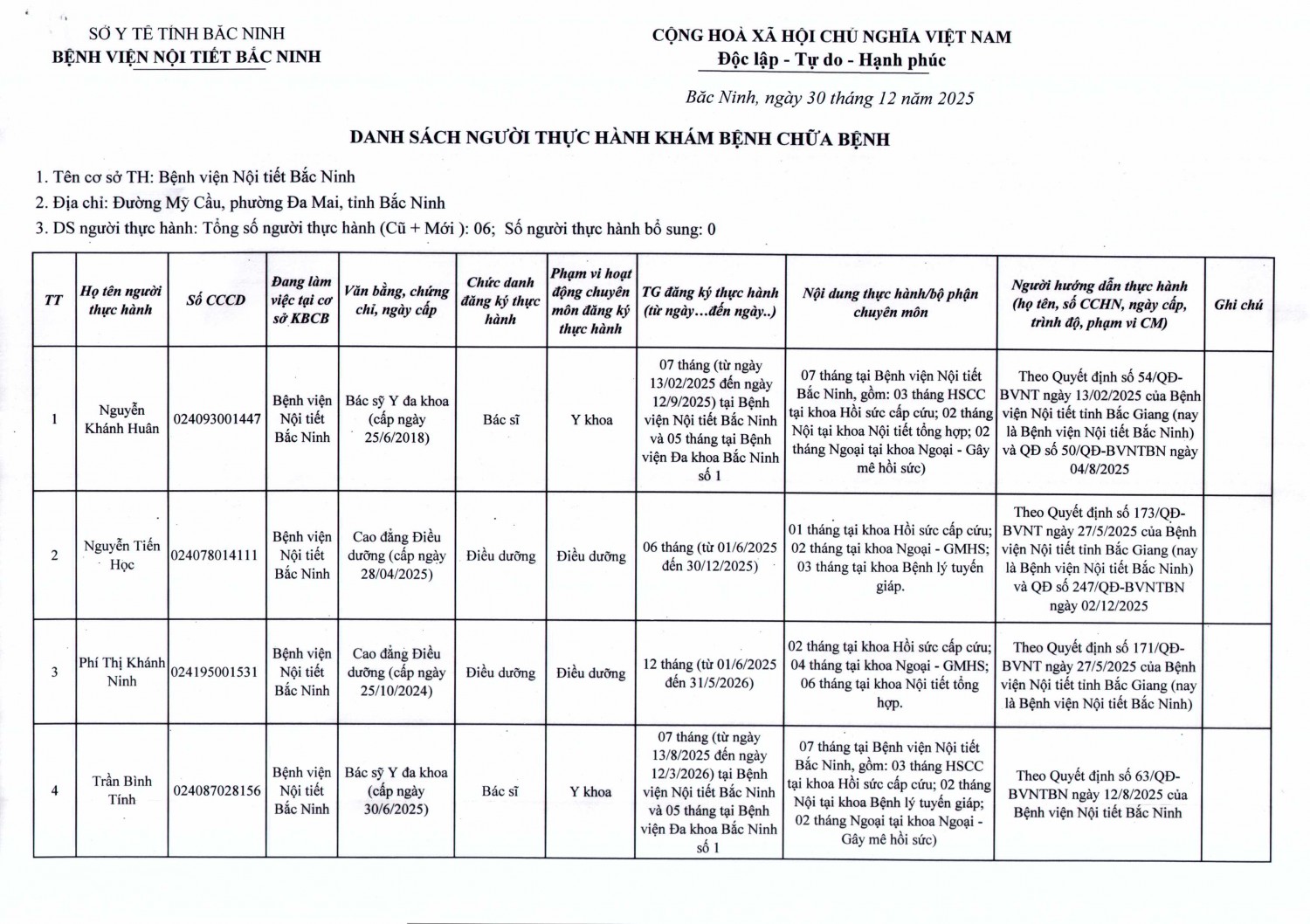 Danh sách người thực hành khám chữa bệnh tại Bệnh viện Nội tiết Bắc Ninh