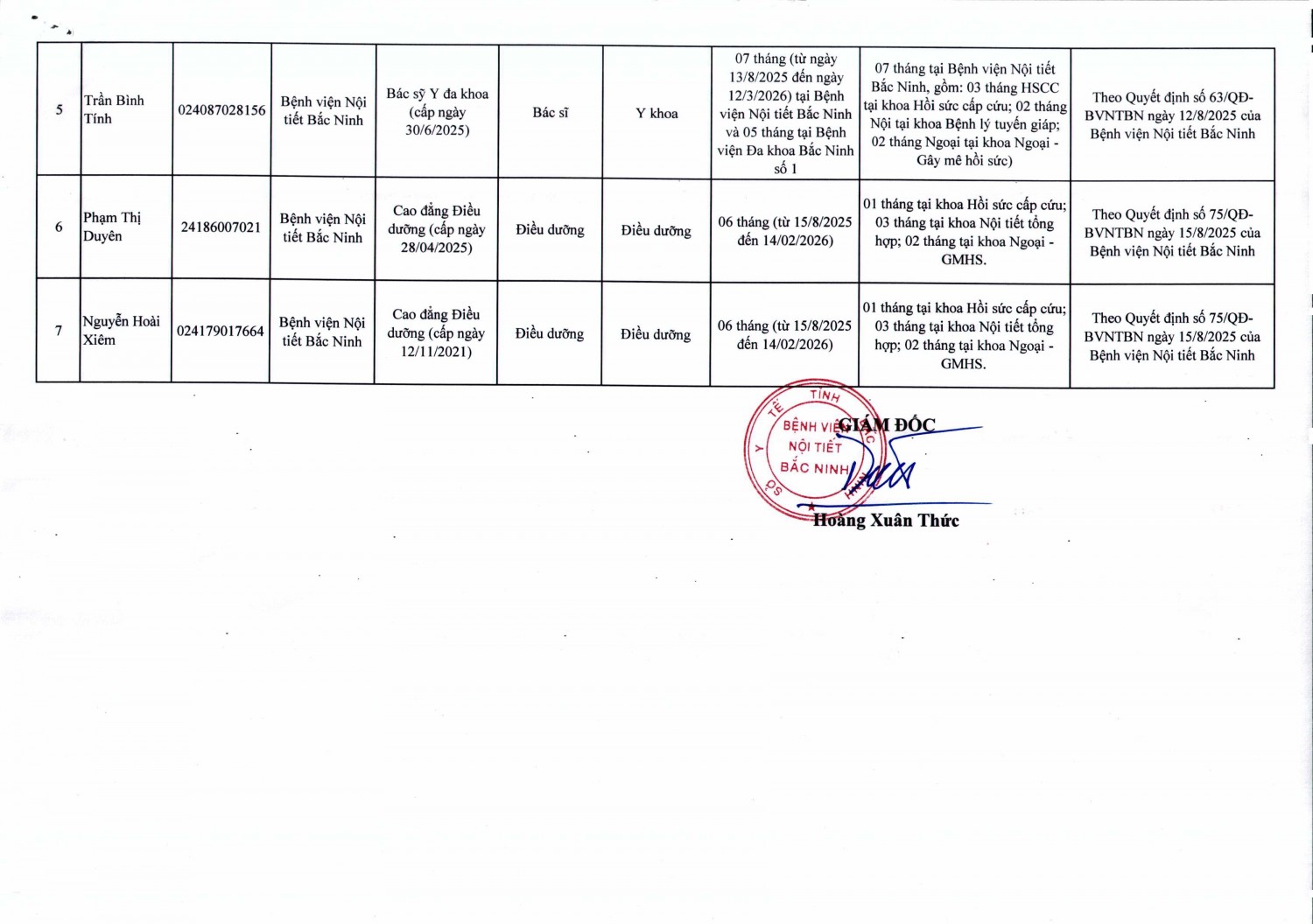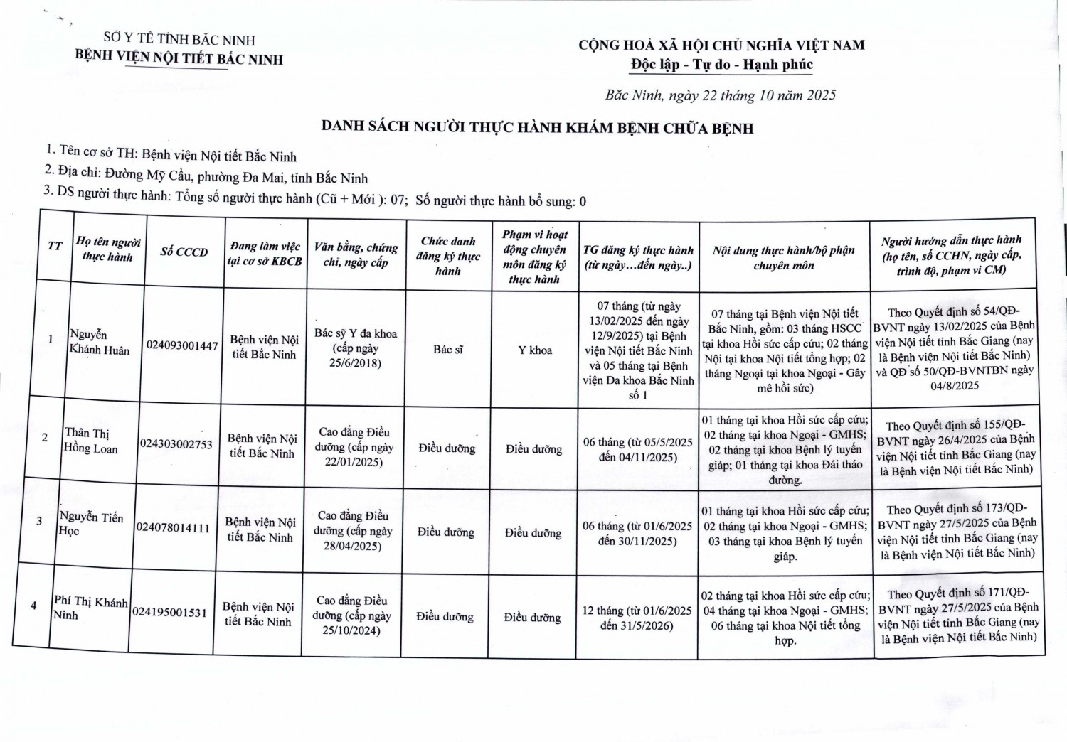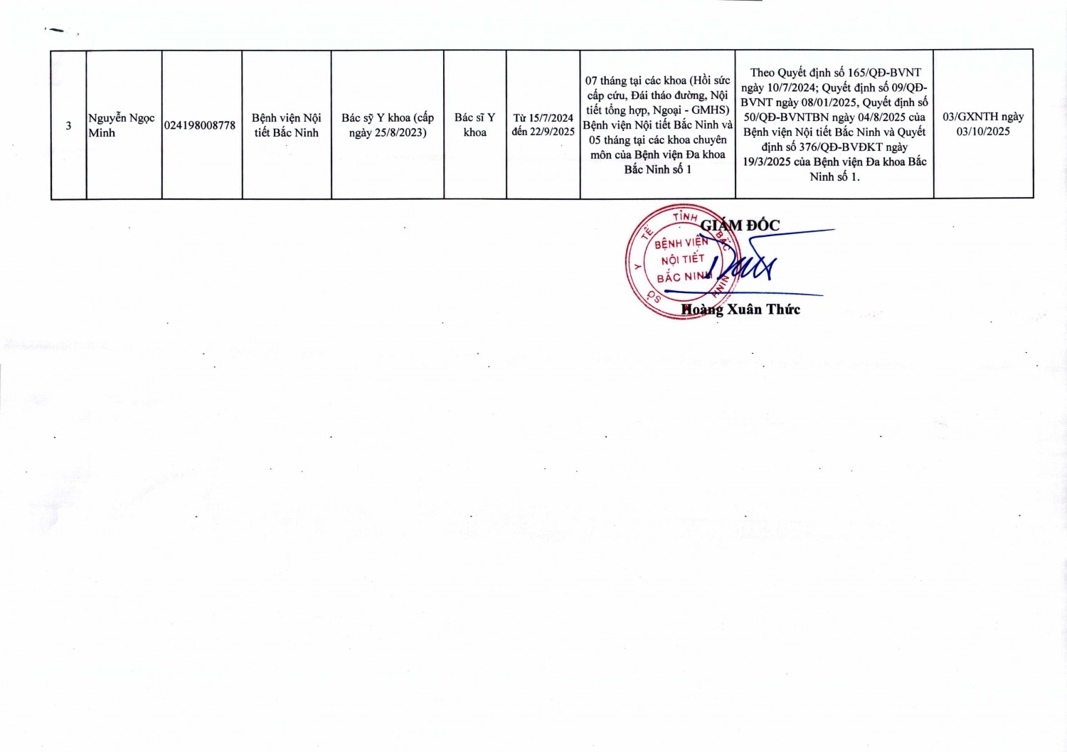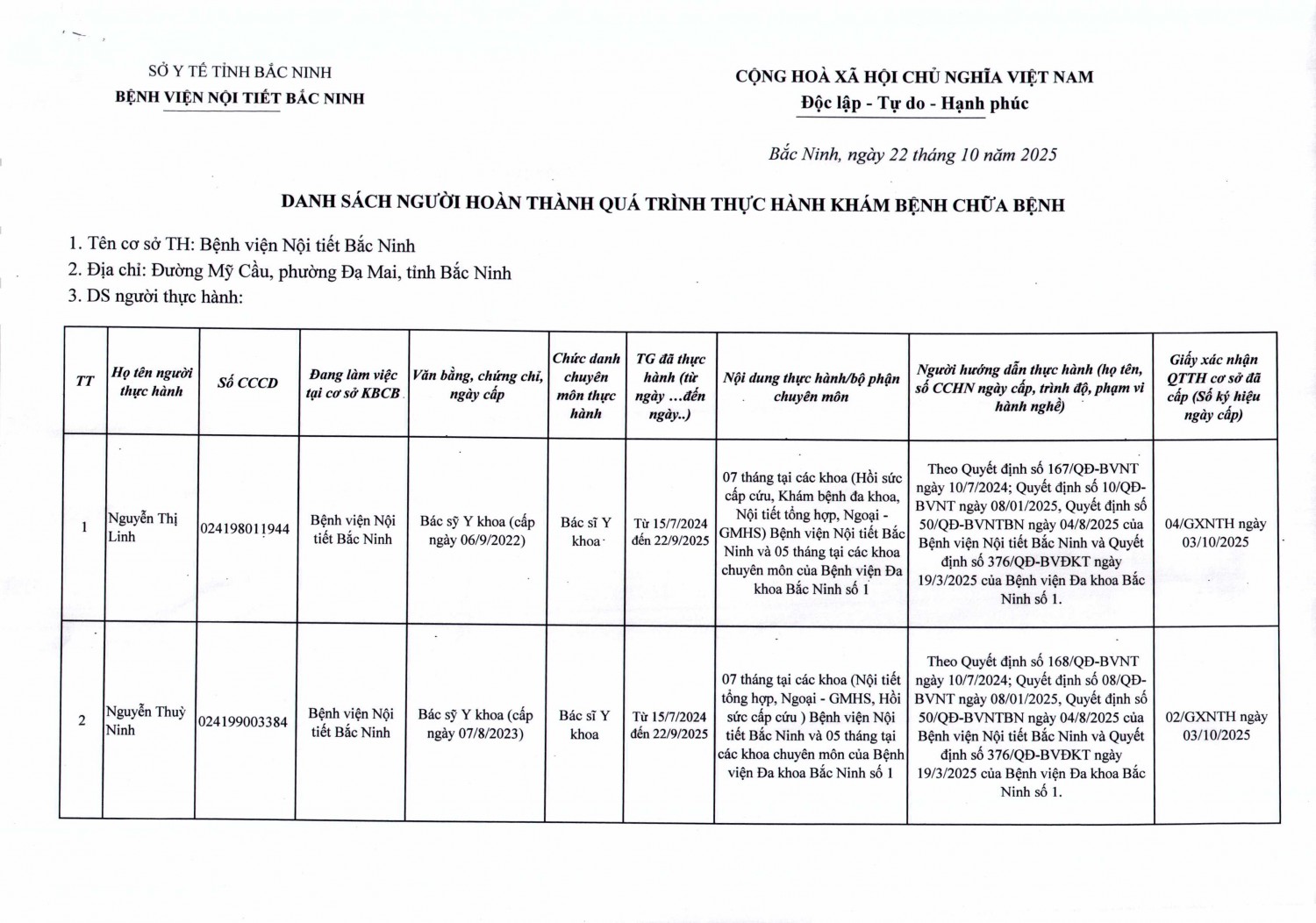 Danh sách người thực hành và đã hoàn thành quá trình thực hành khám chữa bệnh tại Bệnh viện Nội tiết