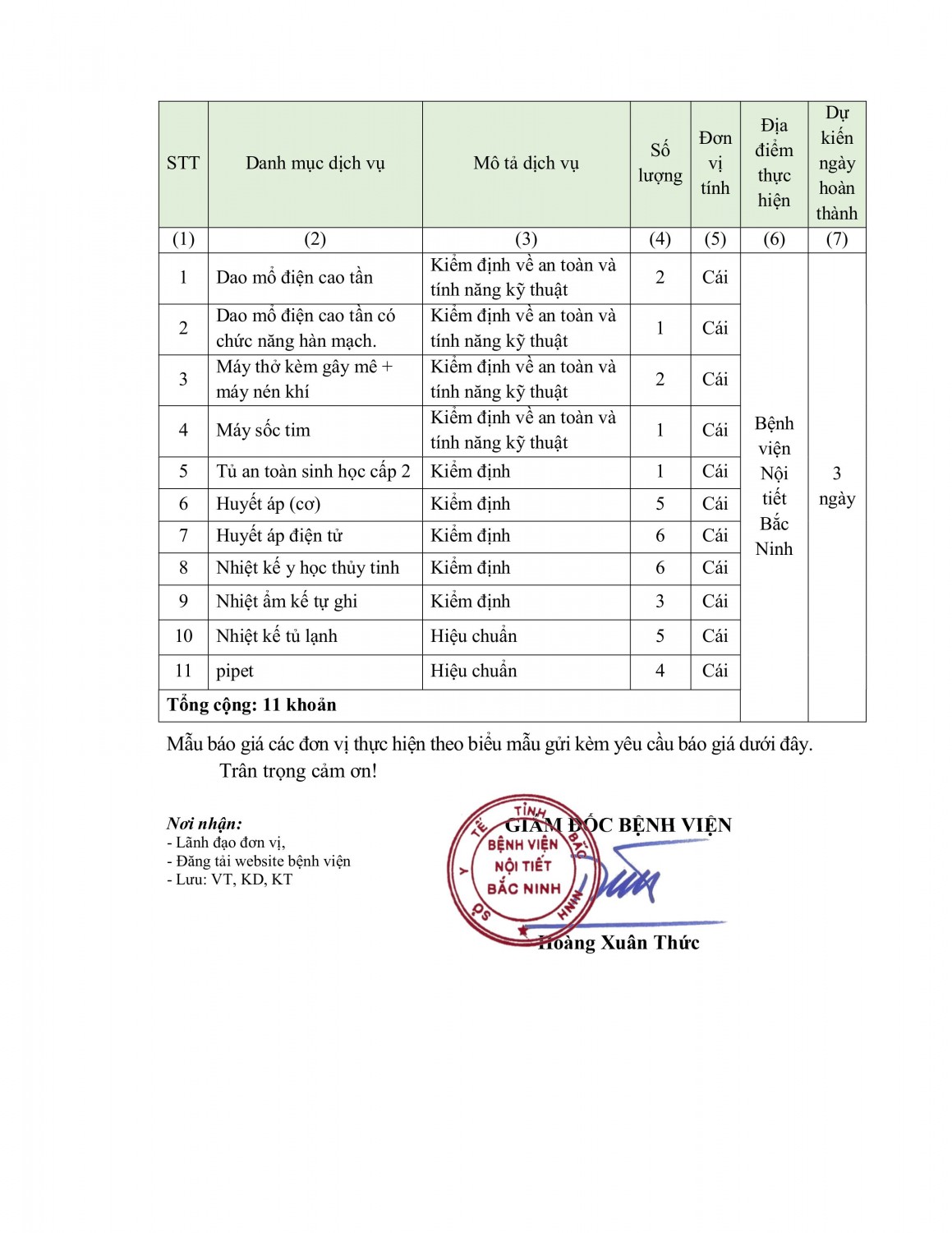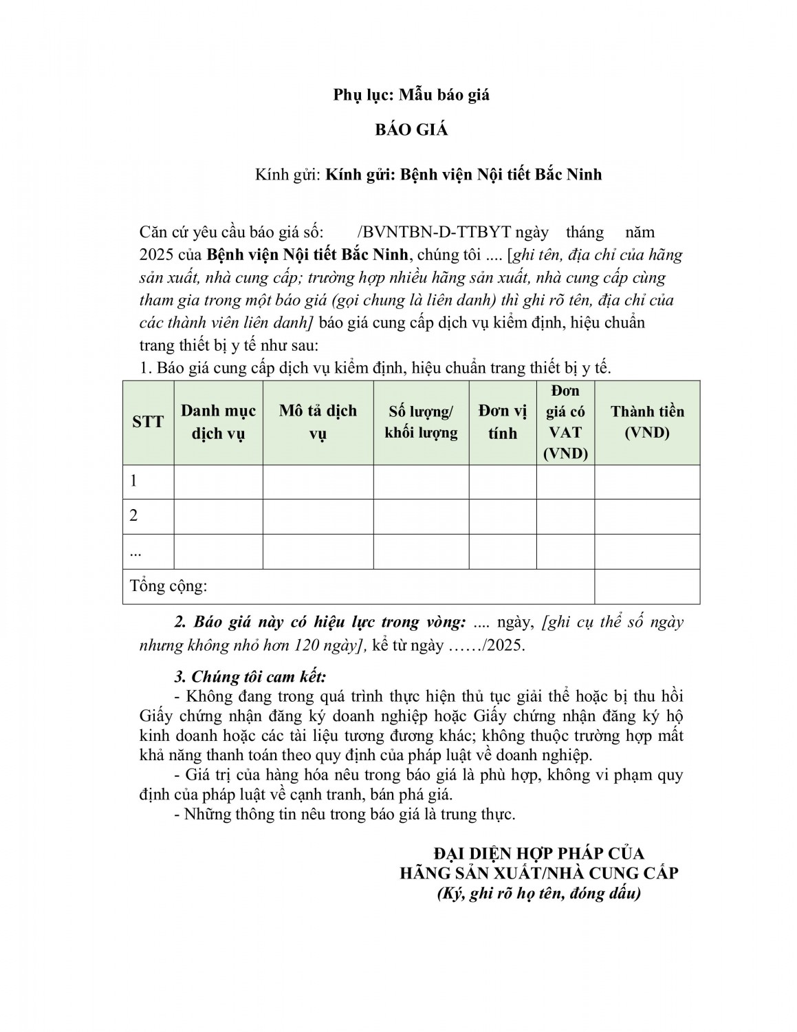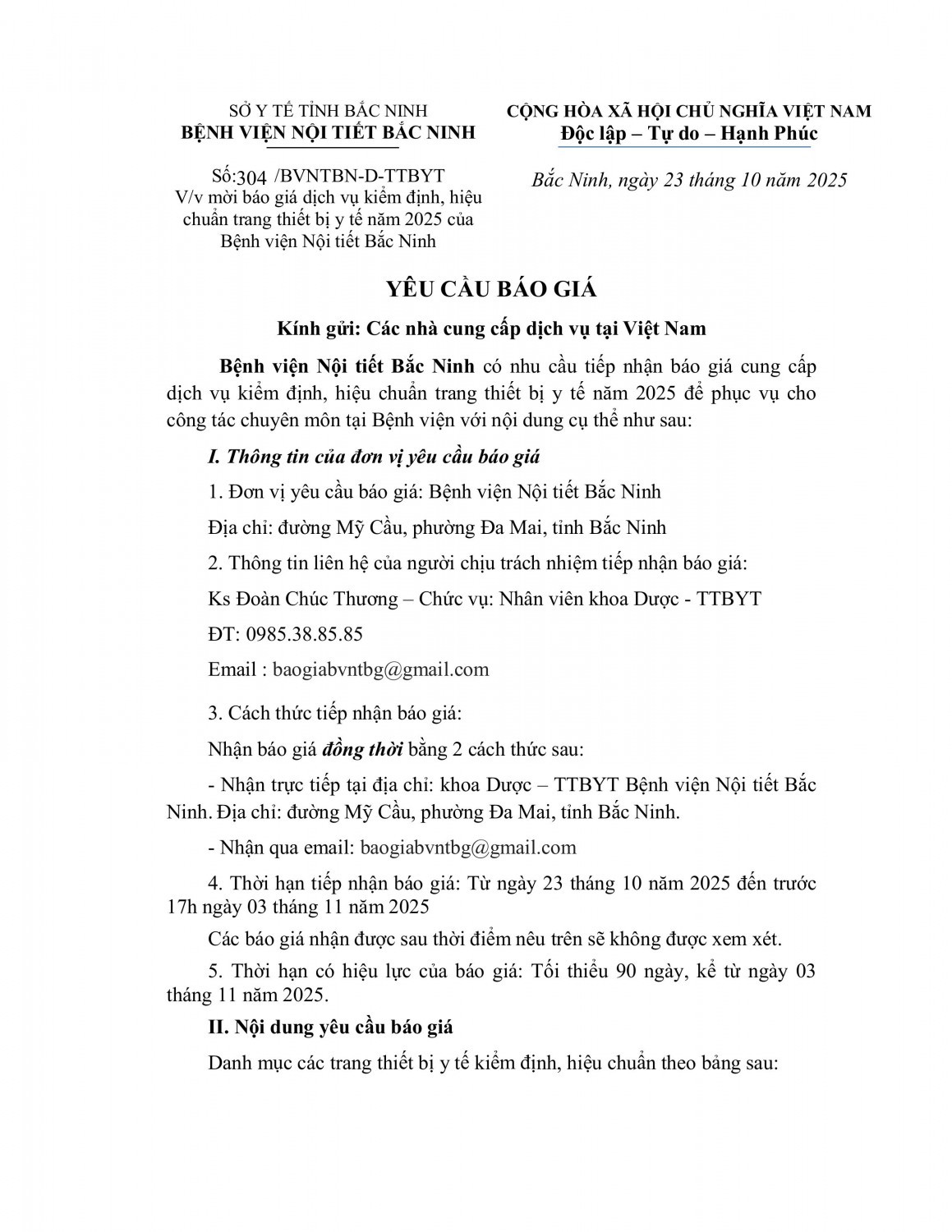 Bệnh viện Nội tiết Bắc Ninh có nhu cầu tiếp nhận báo giá cung cấp dịch vụ kiểm định, hiệu chuẩn trang thiết bị y tế năm 2025 để phục vụ cho công tác chuyên môn tại Bệnh viện với nội dung cụ thể như sau
