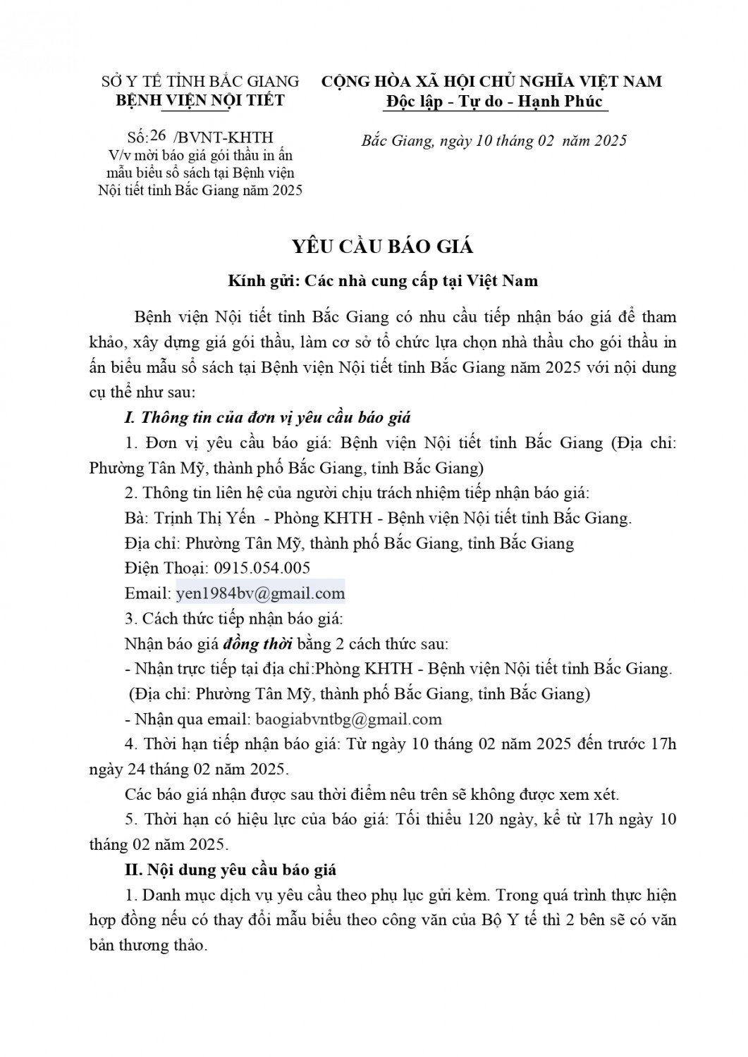 Mời báo giá vật tư xét nghiệm, hóa chất phục vụ khám chữa bệnh năm 2025- 2026 của Bệnh viện Nội tiết Bắc Ninh