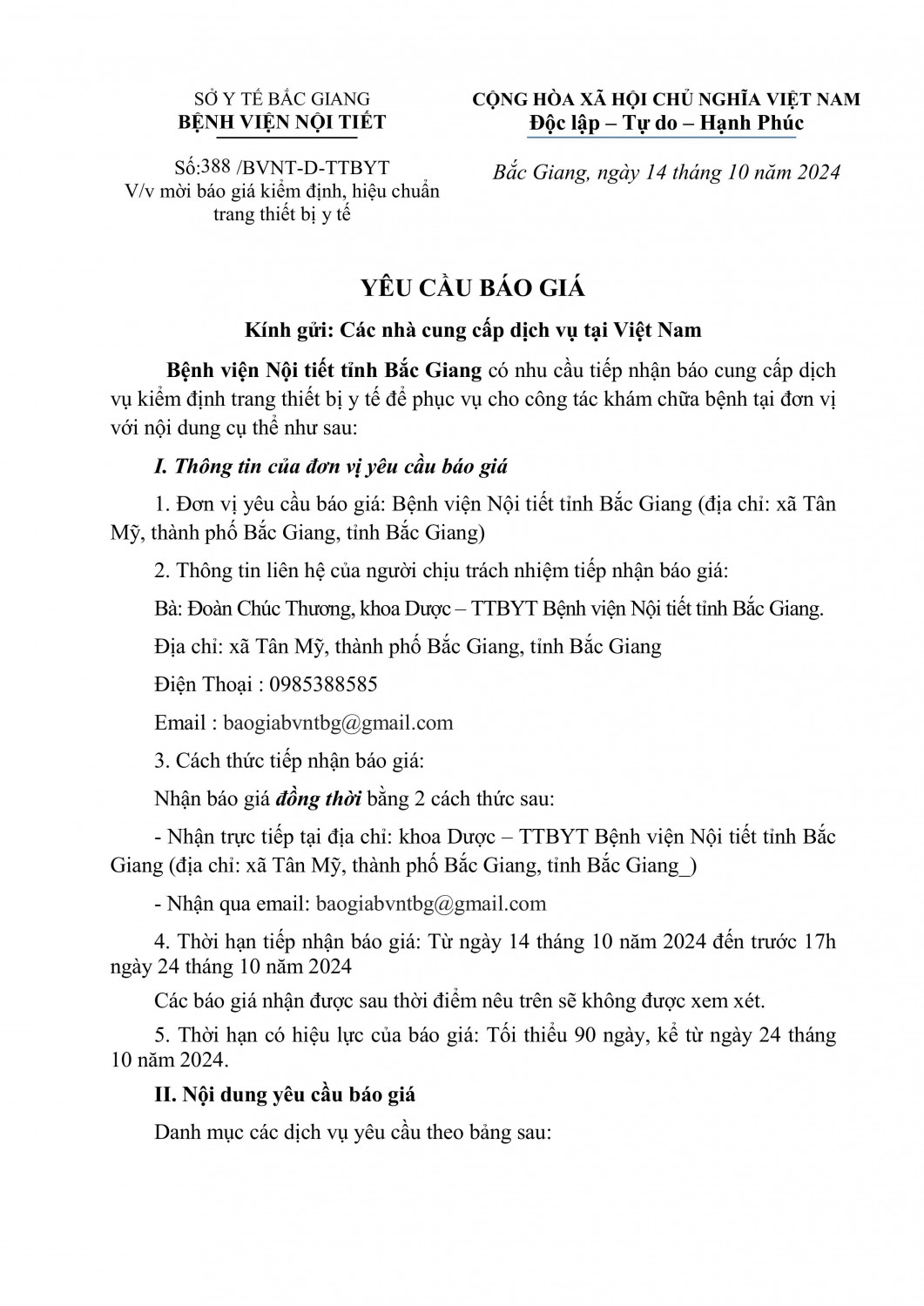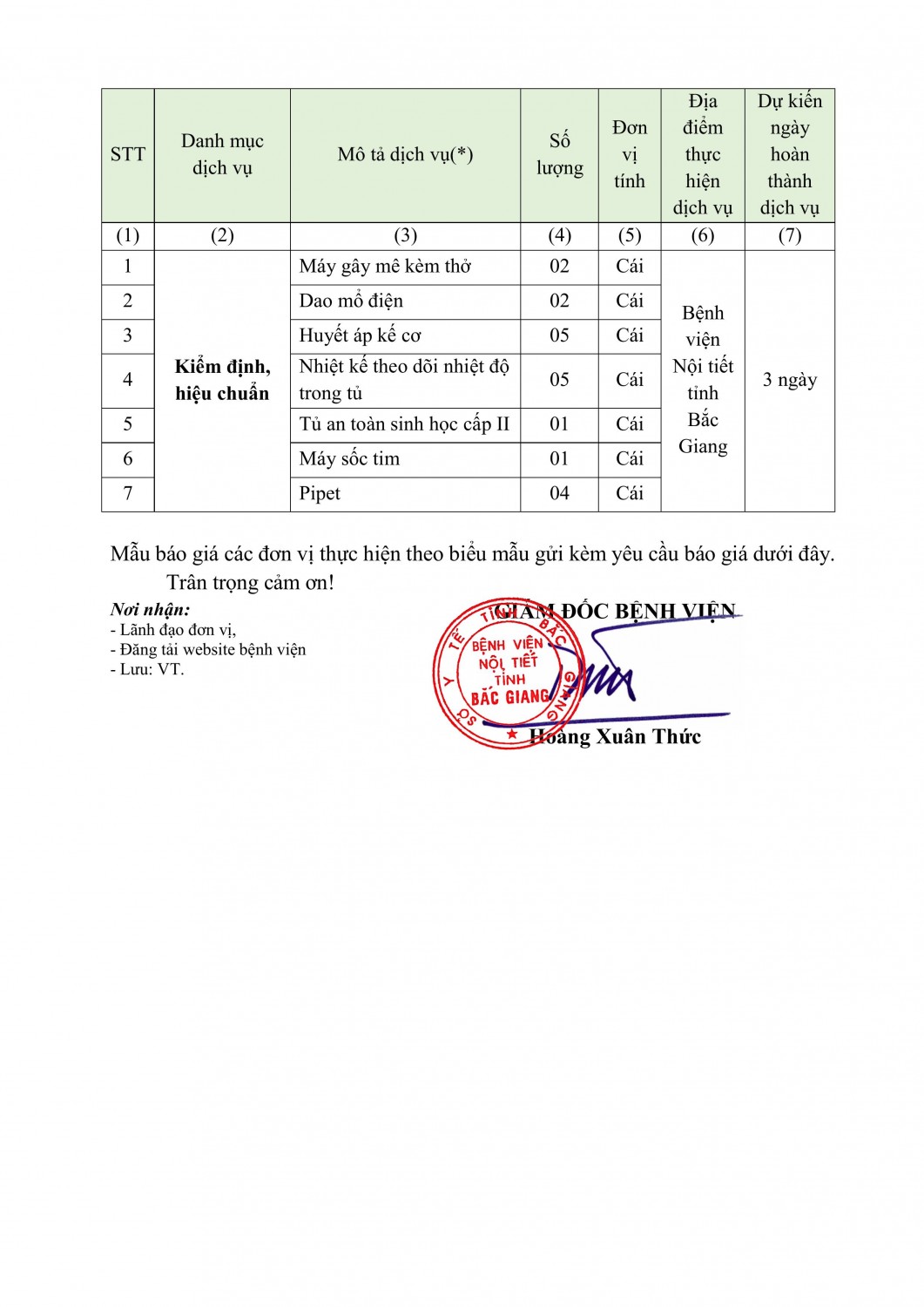 Bệnh viện Nội tiết tỉnh Bắc Giang có nhu cầu tiếp nhận báo cung cấp dịch vụ kiểm định trang thiết bị y tế để phục vụ cho công tác khám chữa bệnh tại đơn vị với nội dung cụ thể như sau