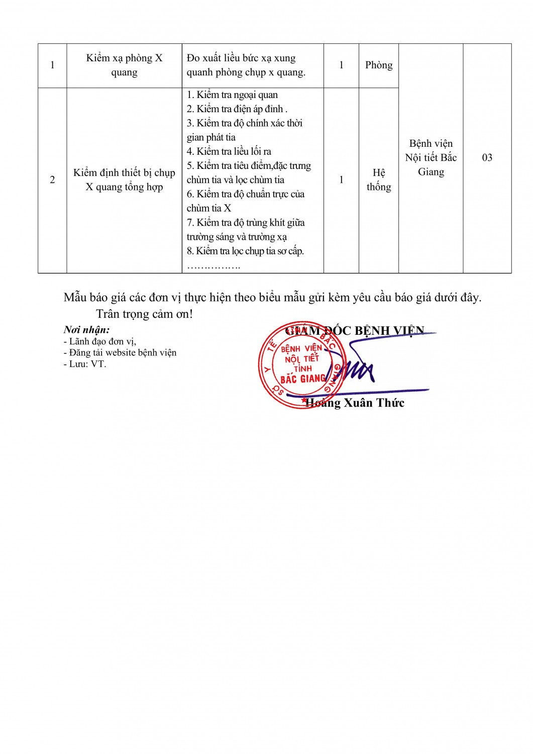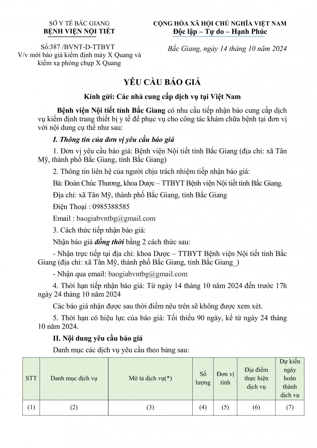 Bệnh viện Nội tiết tỉnh Bắc Giang có nhu cầu tiếp nhận báo cung cấp dịch vụ kiểm định trang thiết bị y tế để phục vụ cho công tác khám chữa bệnh tại đơn vị với nội dung cụ thể như sau: