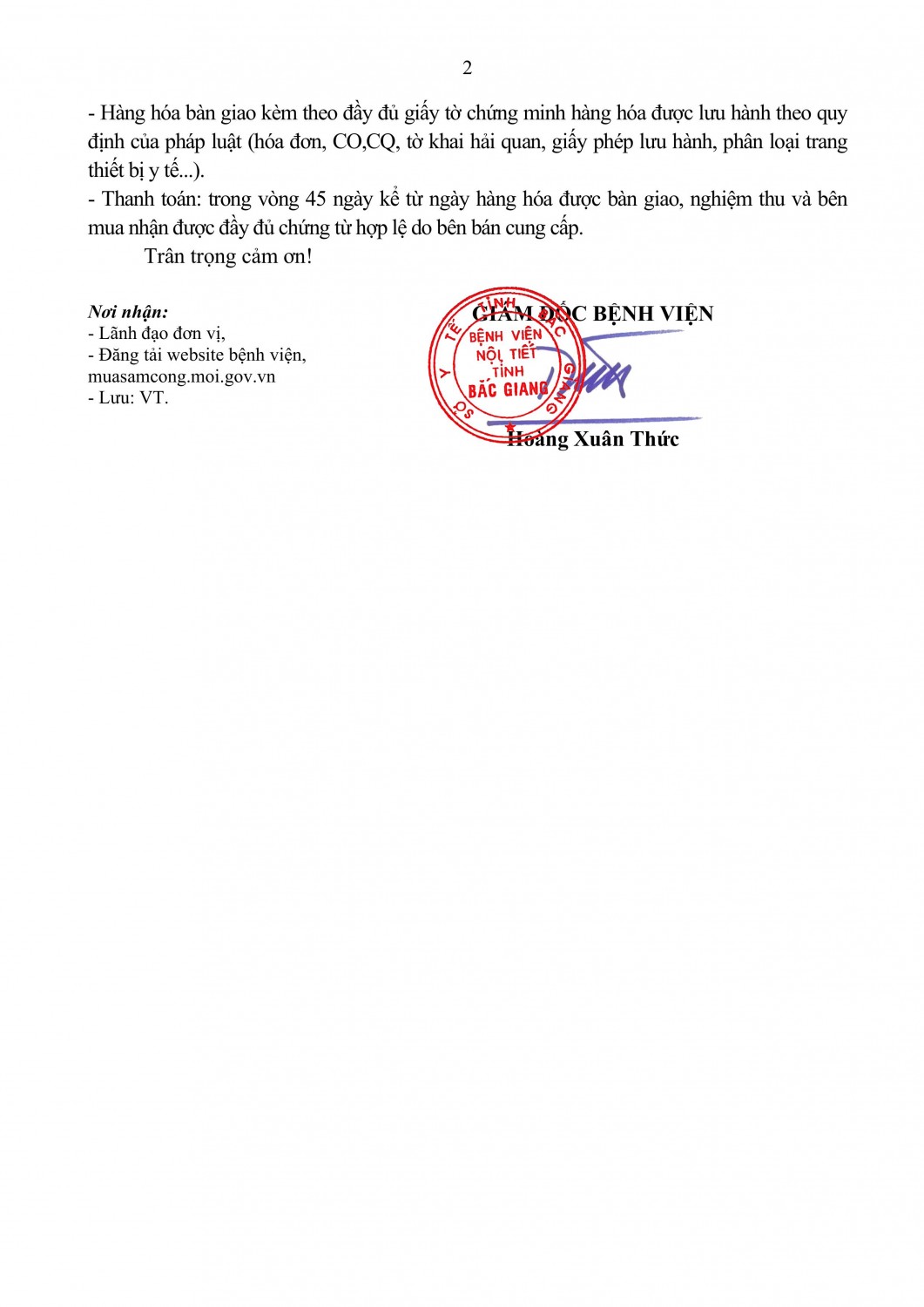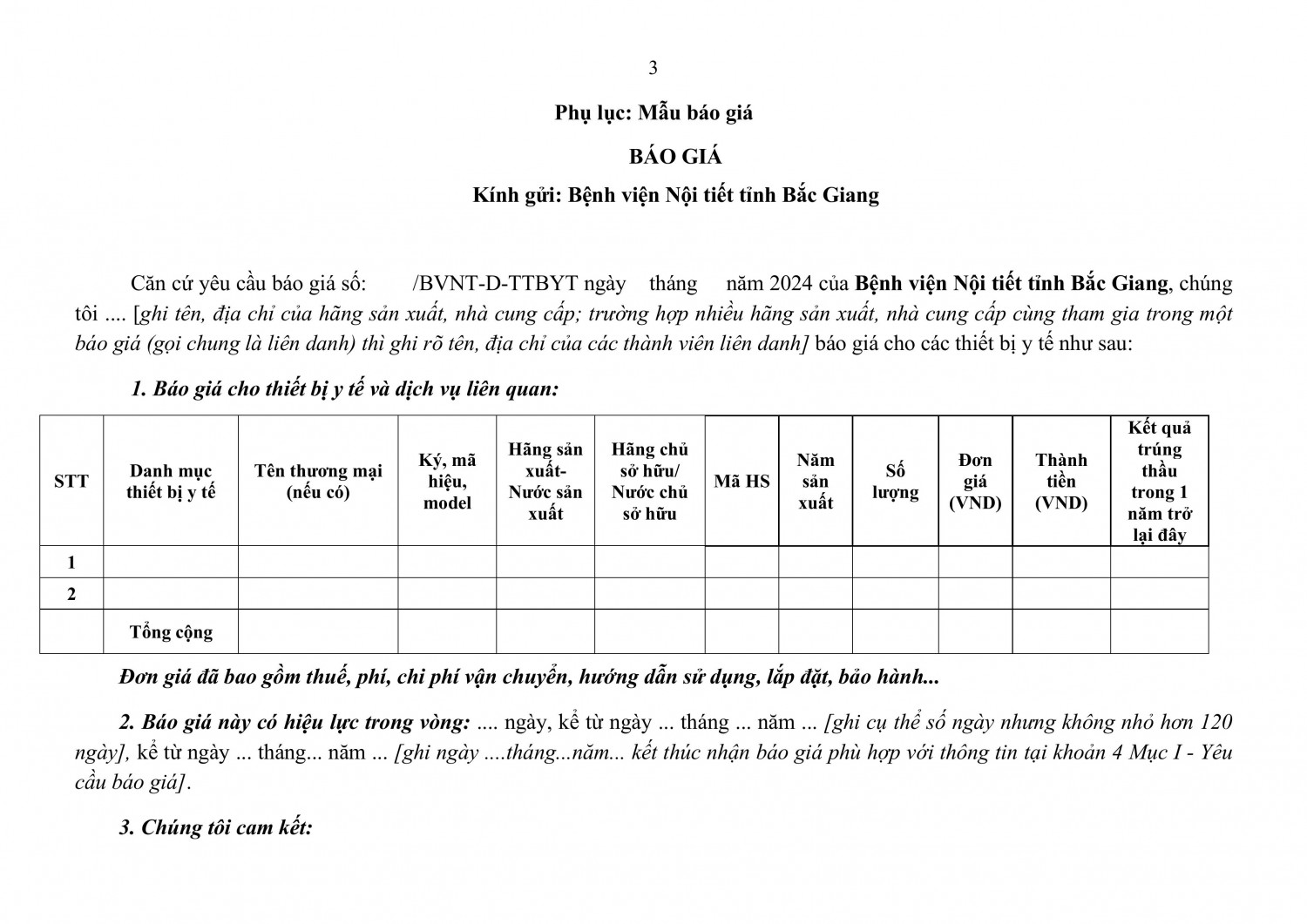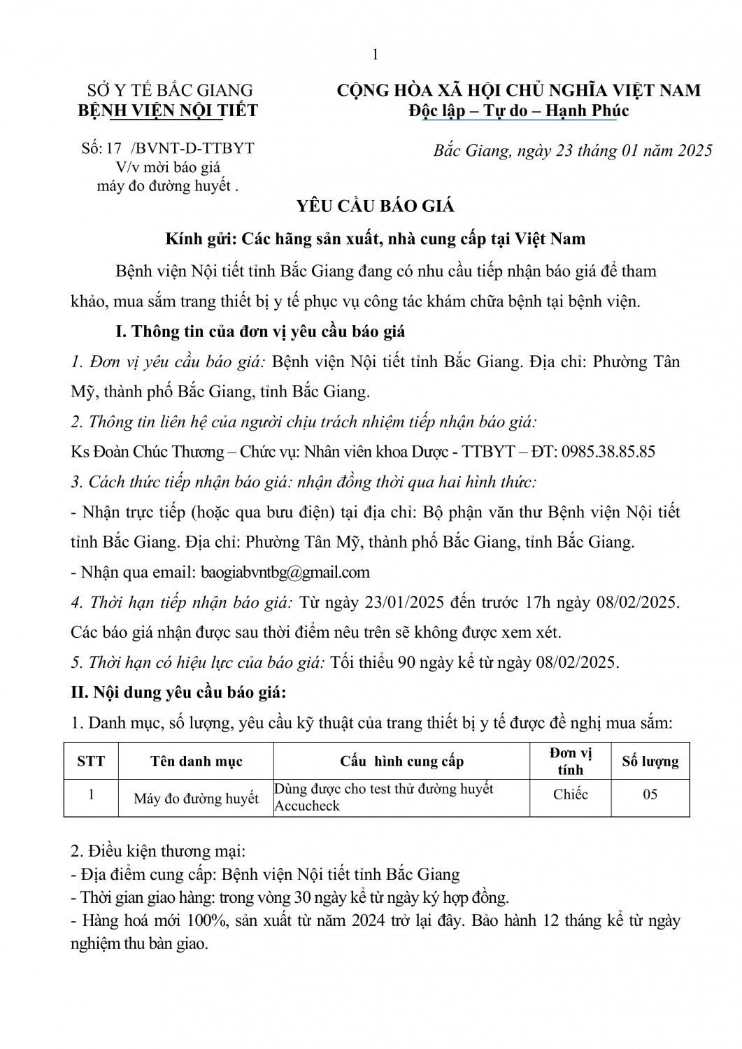Bệnh viện Nội tiết tỉnh Bắc Giang đang có nhu cầu tiếp nhận báo giá để tham khảo, mua sắm trang thiết bị y tế phục vụ công tác khám chữa bệnh tại bệnh viện.