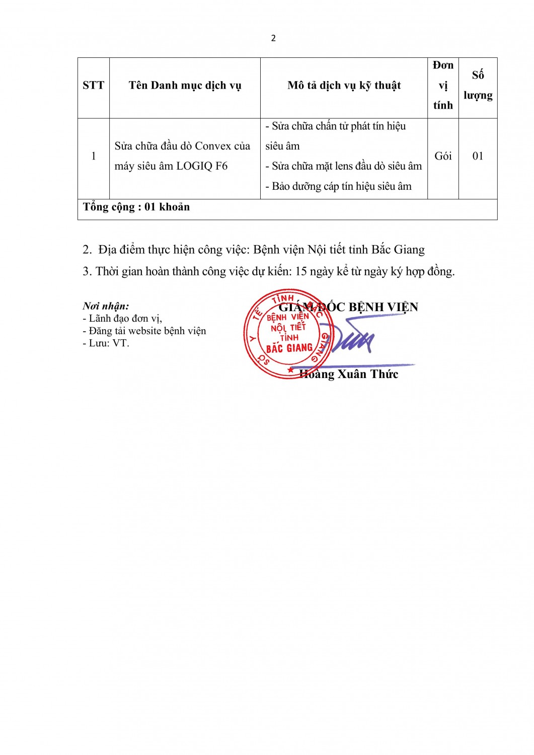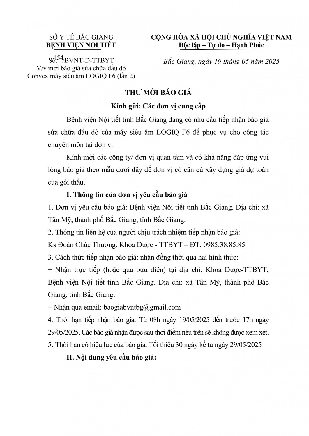 Bệnh viện Nội tiết tỉnh Bắc Giang đang có nhu cầu tiếp nhận báo giá sửa chữa đầu dò của máy siêu âm LOGIQ F6 để phục vụ cho công tác chuyên môn tại đơn vị.