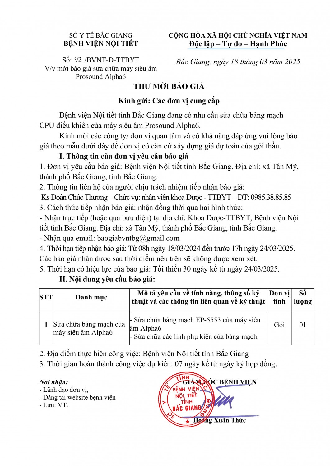 Bệnh viện Nội tiết tỉnh Bắc Giang đang có nhu cầu sửa chữa bảng mạch CPU điều khiển của máy siêu âm Prosound Alpha6