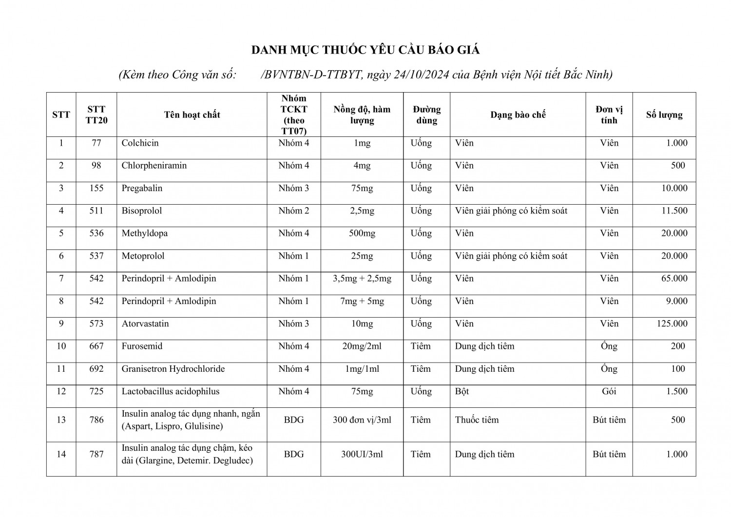 Hiện tại, Bệnh viện Nội tiết Bắc Ninh đang có nhu cầu mua một số thuốc phục vụ nhu cầu khám chữa bệnh năm 2025-2026. Bệnh viện mời các Quý doanh nghiệp dược quan tâm, cung cấp thông tin về giá thuốc, theo các nội dung sau: