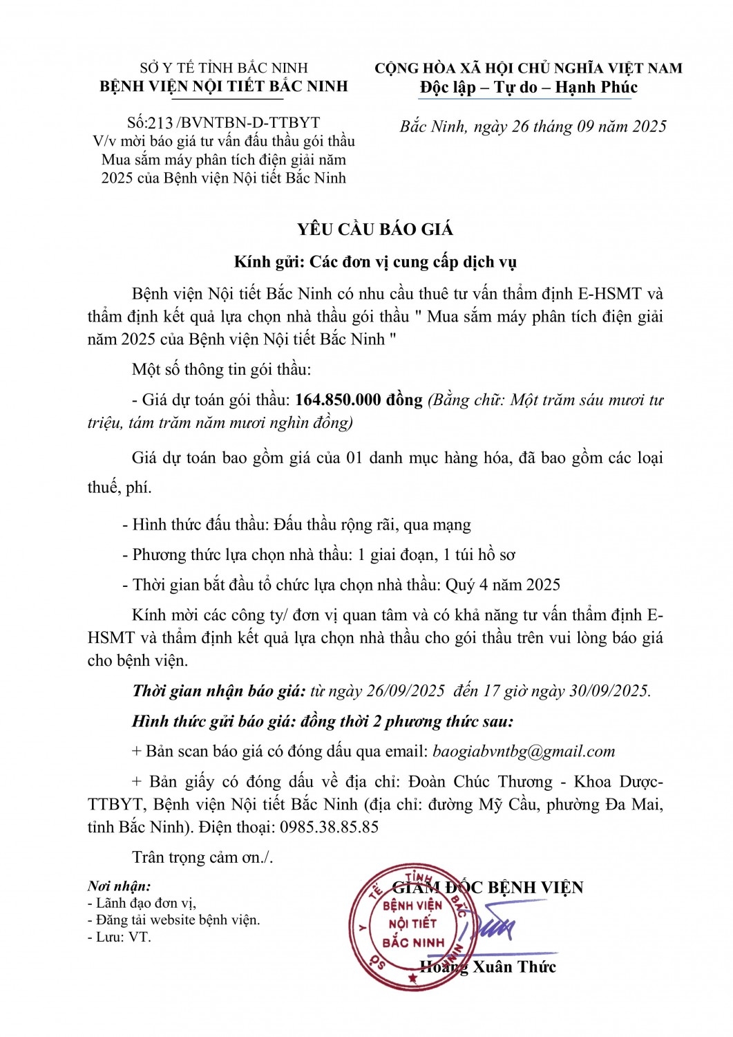 Mời báo giá vật tư xét nghiệm, hóa chất phục vụ khám chữa bệnh năm 2025- 2026 của Bệnh viện Nội tiết Bắc Ninh