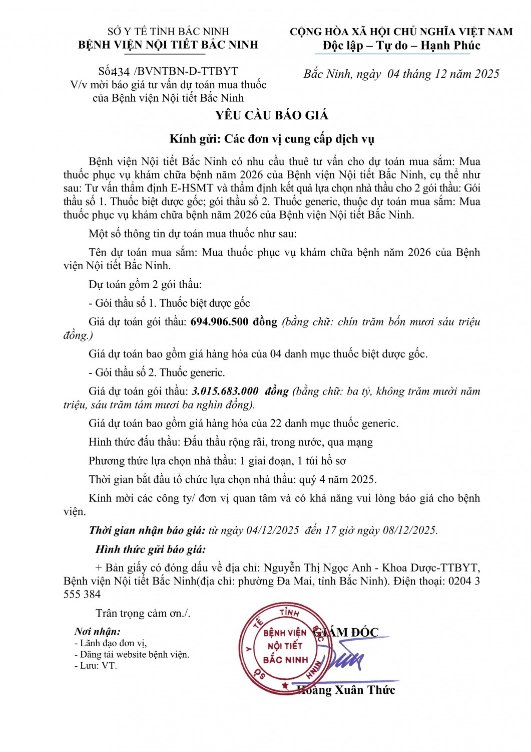 Mời báo giá tư vấn dự toán mua thuốc của Bệnh viện Nội tiết Bắc Ninh