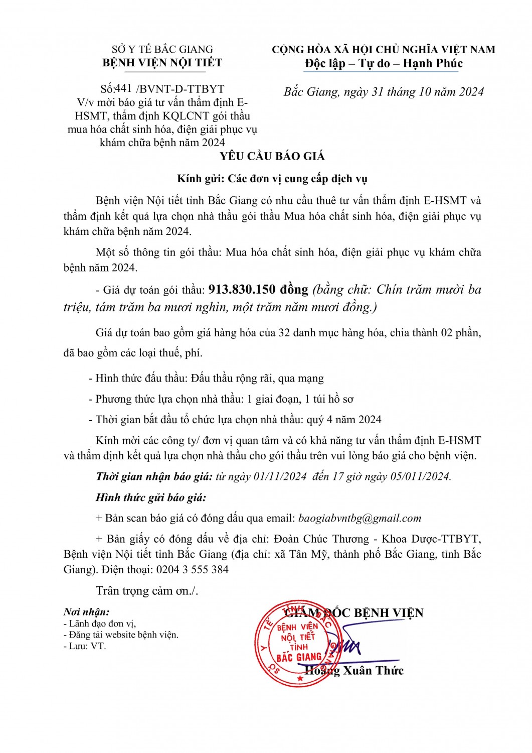 Mời báo giá tư vấn dự toán mua thuốc của Bệnh viện Nội tiết Bắc Ninh