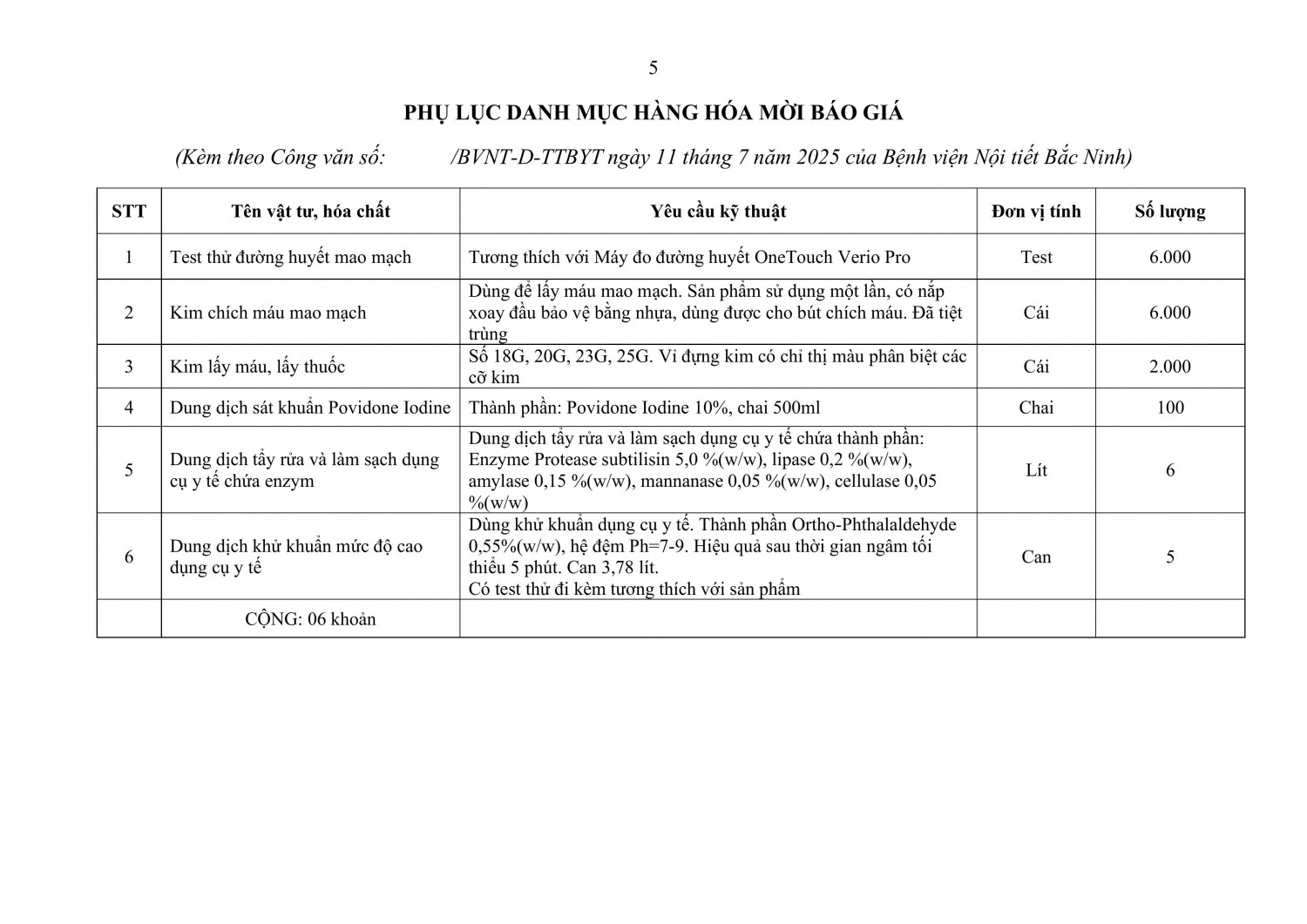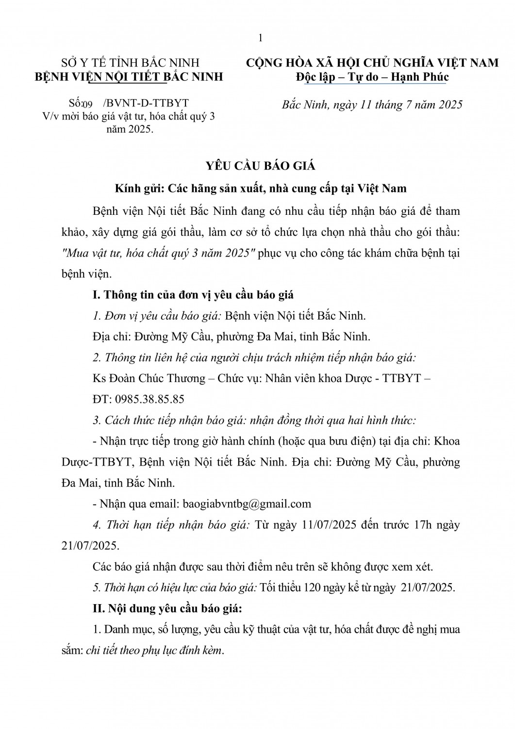 Mời báo giá vật tư xét nghiệm, hóa chất phục vụ khám chữa bệnh năm 2025- 2026 của Bệnh viện Nội tiết Bắc Ninh