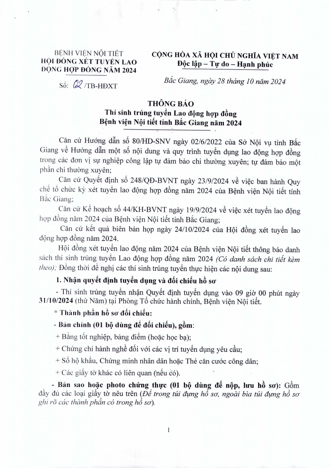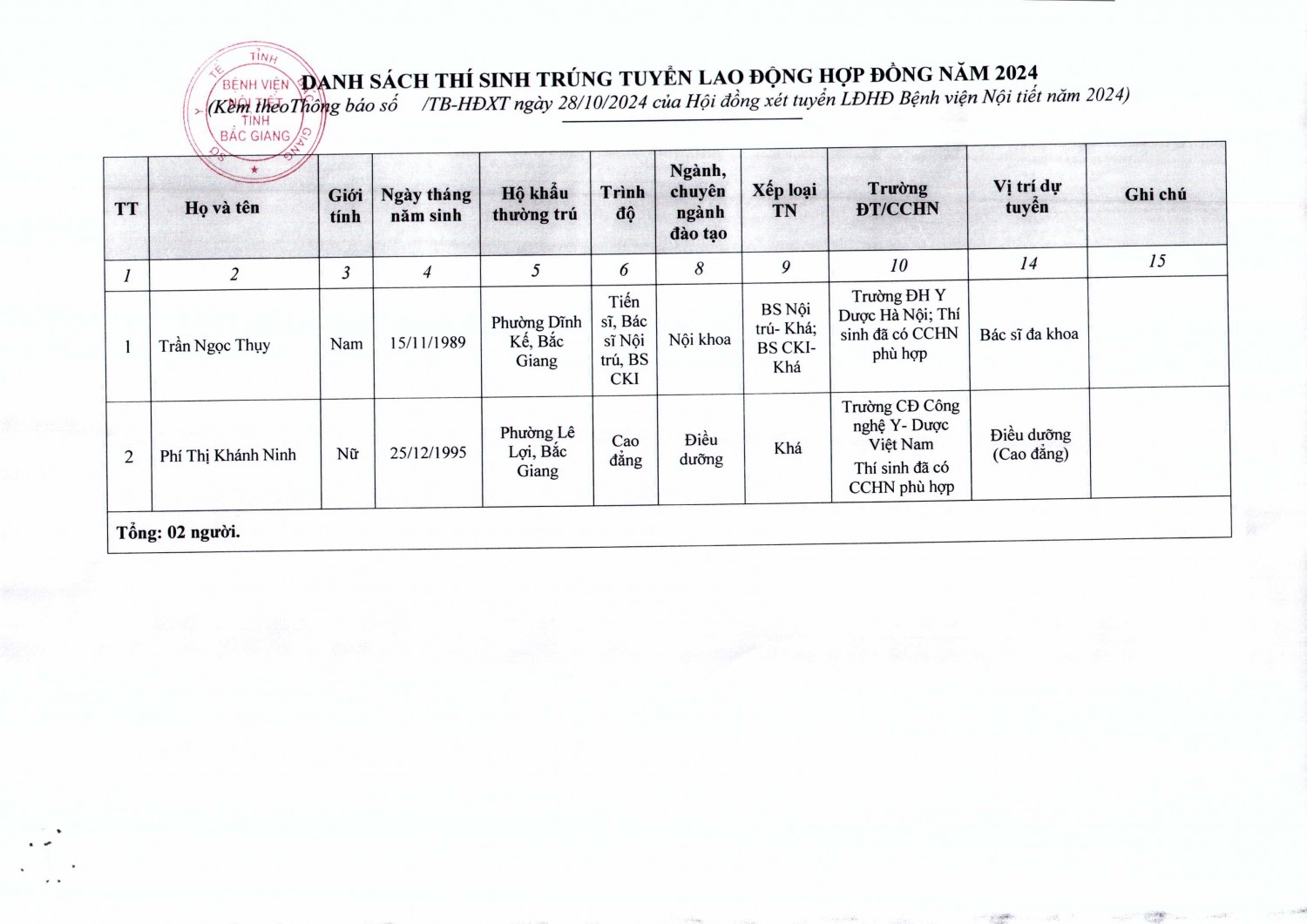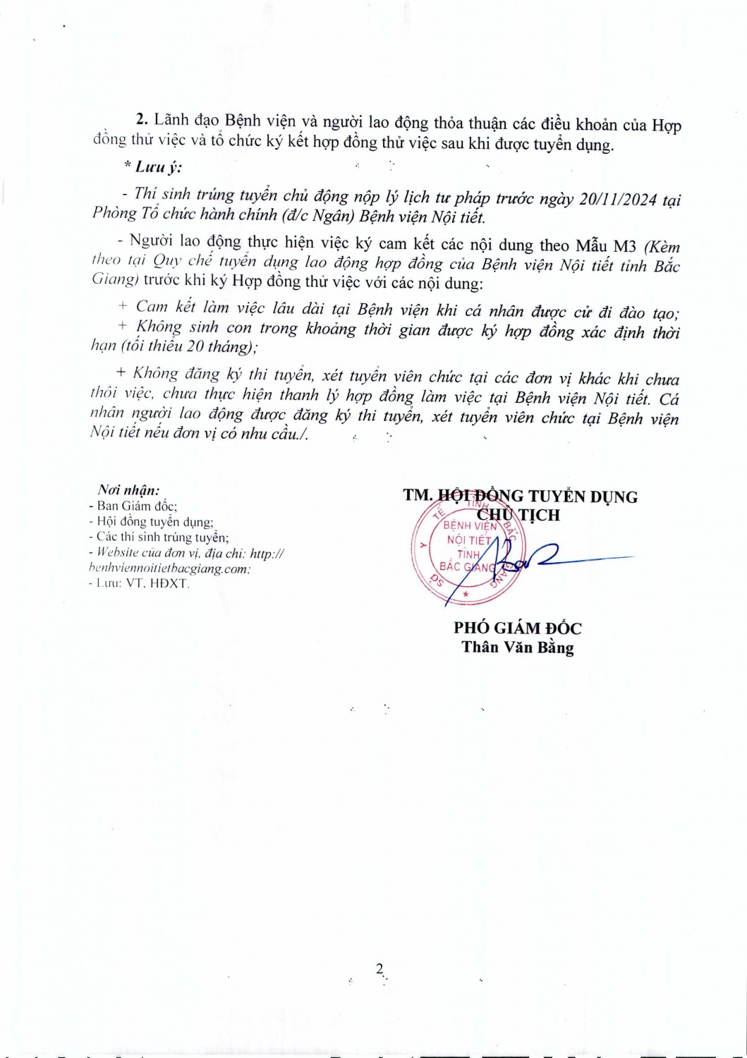 Thông báo Thí sinh trúng tuyển Lao động hợp đồng Bệnh viện Nội tiết tỉnh Bắc Giang năm 2024
