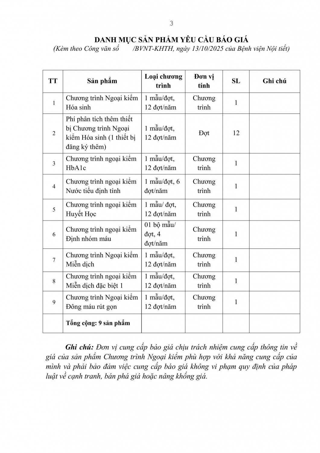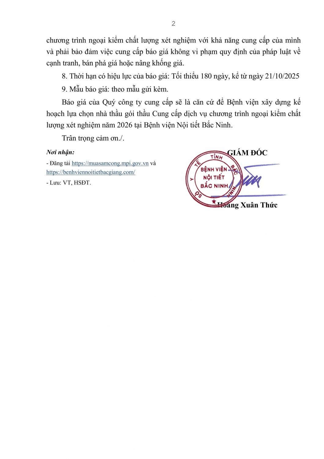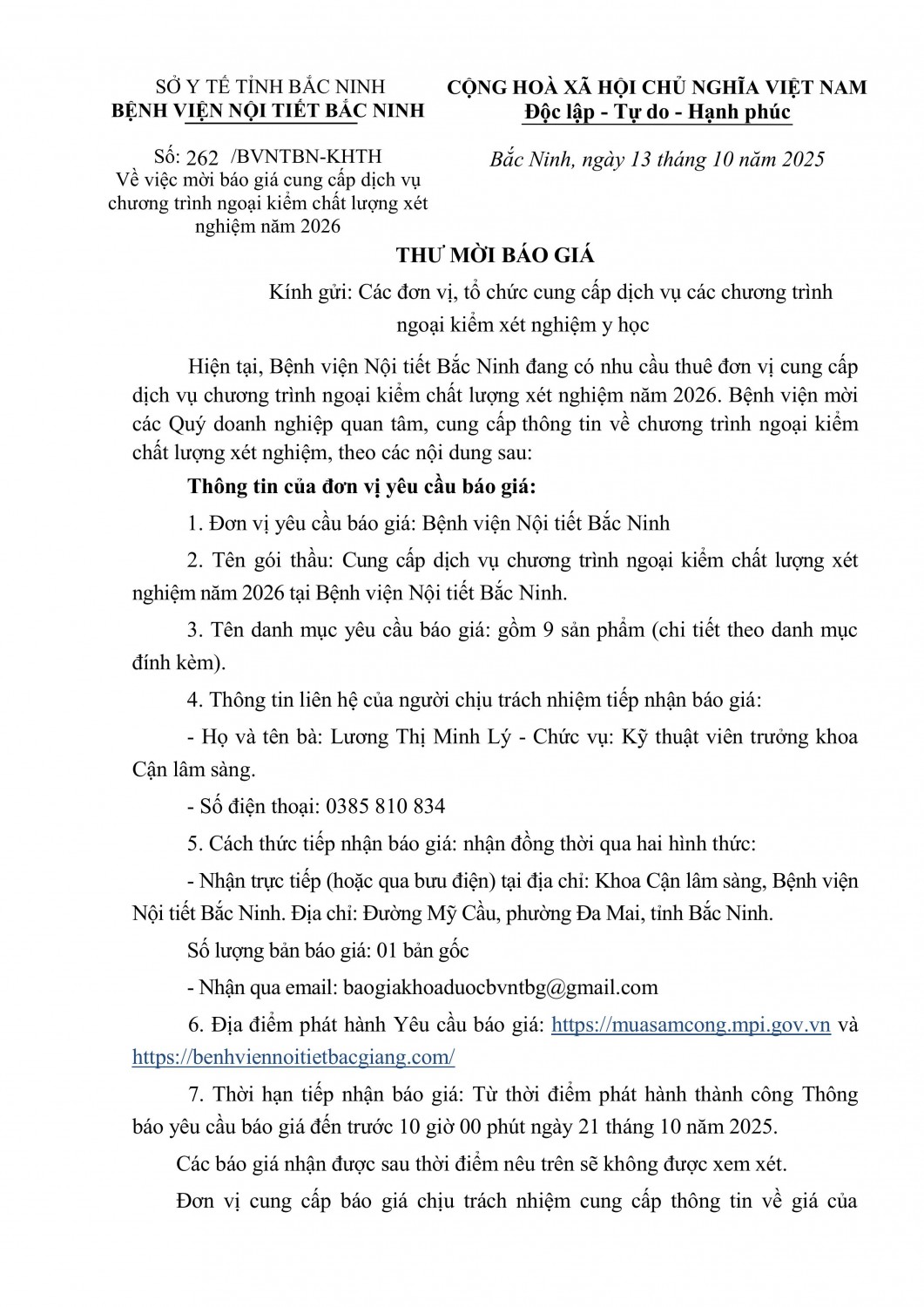 Mời báo giá vật tư xét nghiệm, hóa chất phục vụ khám chữa bệnh năm 2025- 2026 của Bệnh viện Nội tiết Bắc Ninh