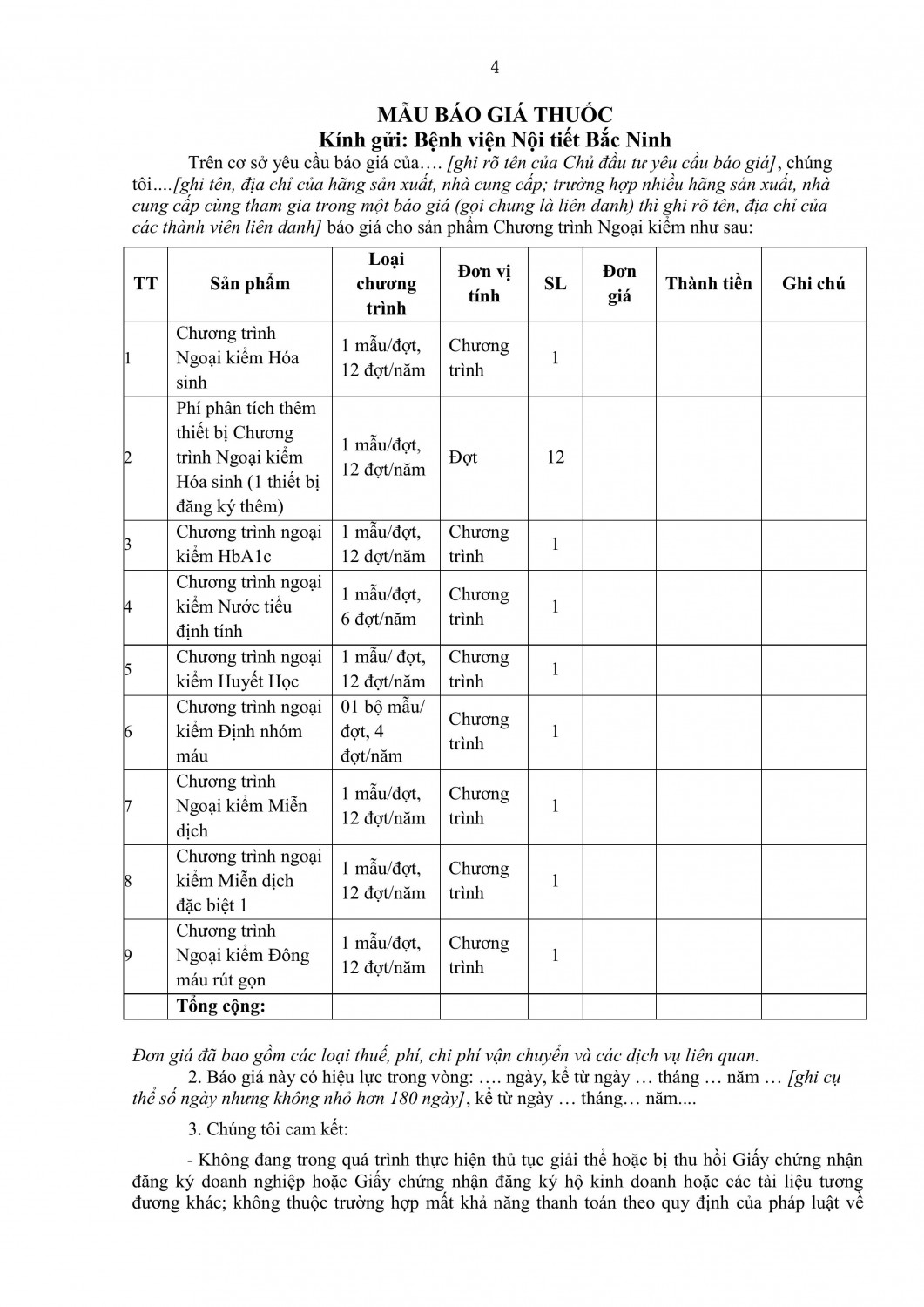Mời báo giá tư vấn dự toán mua thuốc của Bệnh viện Nội tiết Bắc Ninh